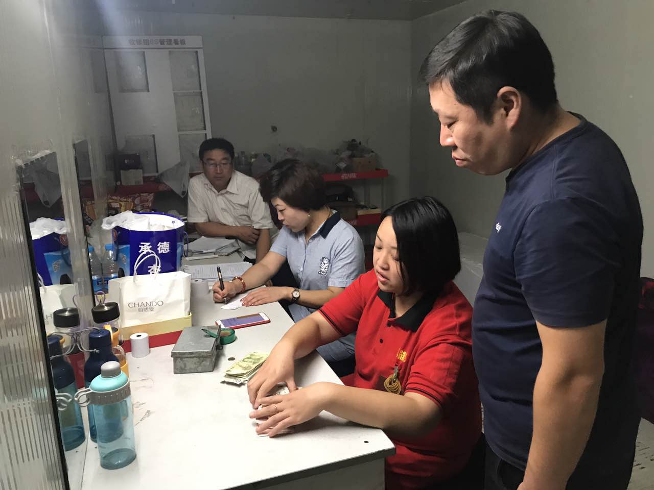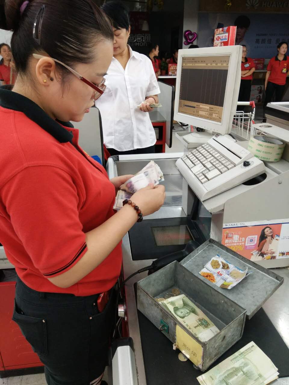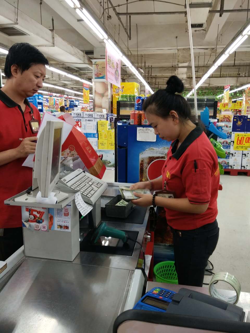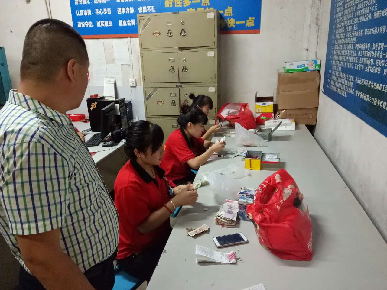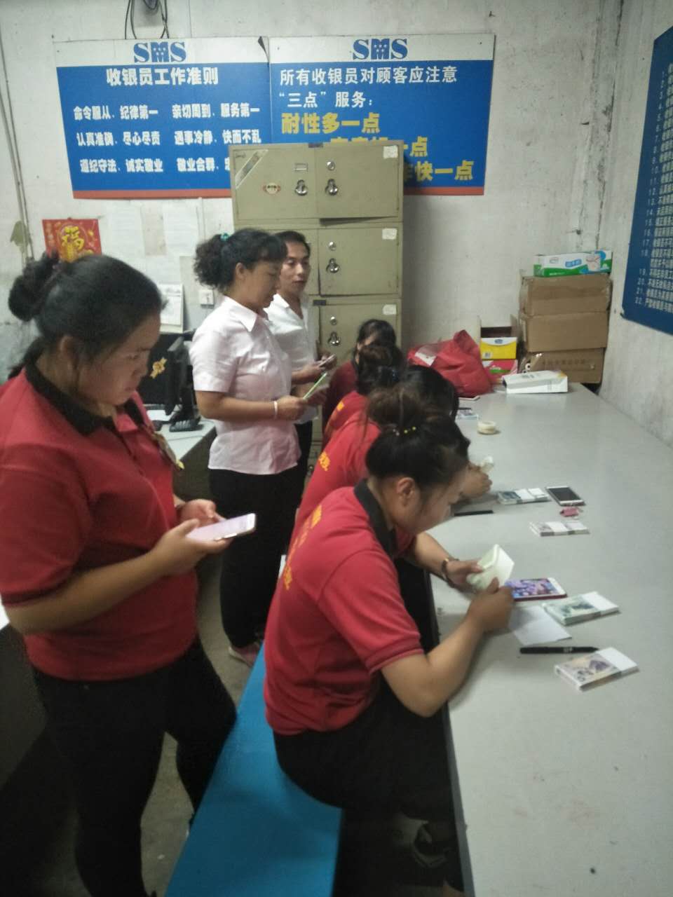 建南店在現金房進行的是緊張激烈的清點營業款比試,在賣場進行的是收銀結賬流程的比武。