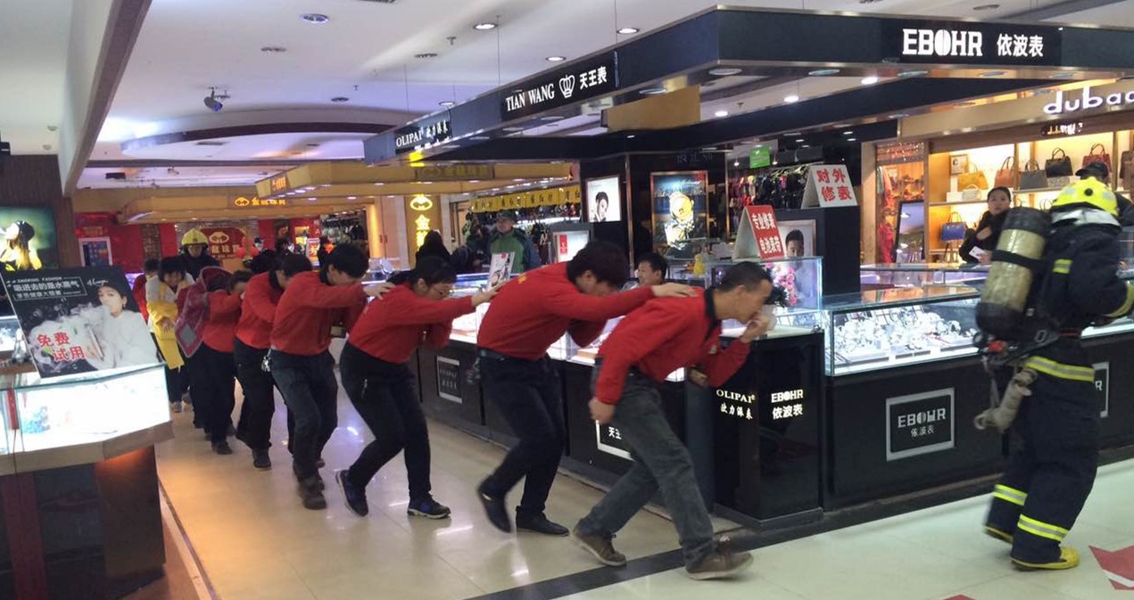 下午15:30,隨著一聲警報的響起,我店管理人員迅速啟動消防應急預案,客服發出報警廣播,并立即組織顧客和員工迅速從安全出口撤離現場,整個演練過程緊張有序,有條不紊。